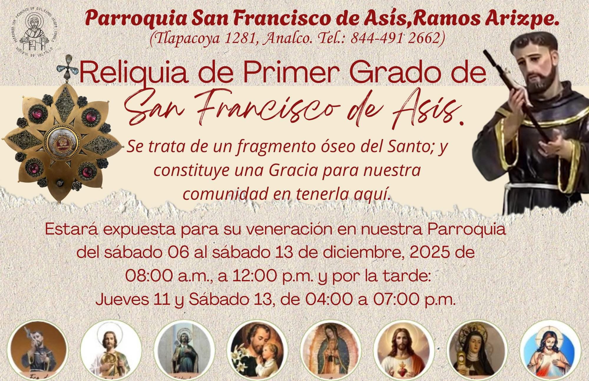 La comunidad católica de Ramos Arizpe tiene la oportunidad de venerar una reliquia de primer grado de San Francisco de Asís, considerada una de las piezas de mayor valor espiritual dentro de la tradición franciscana. La Parroquia de San Francisco de Asís, ubicada en la colonia Analco en Ramos Arizpe, confirmó que el relicario, que contiene un fragmento óseo del Santo de Asís, permanece expuesto desde el pasado sábado 6 hasta el sábado 13 de diciembre.