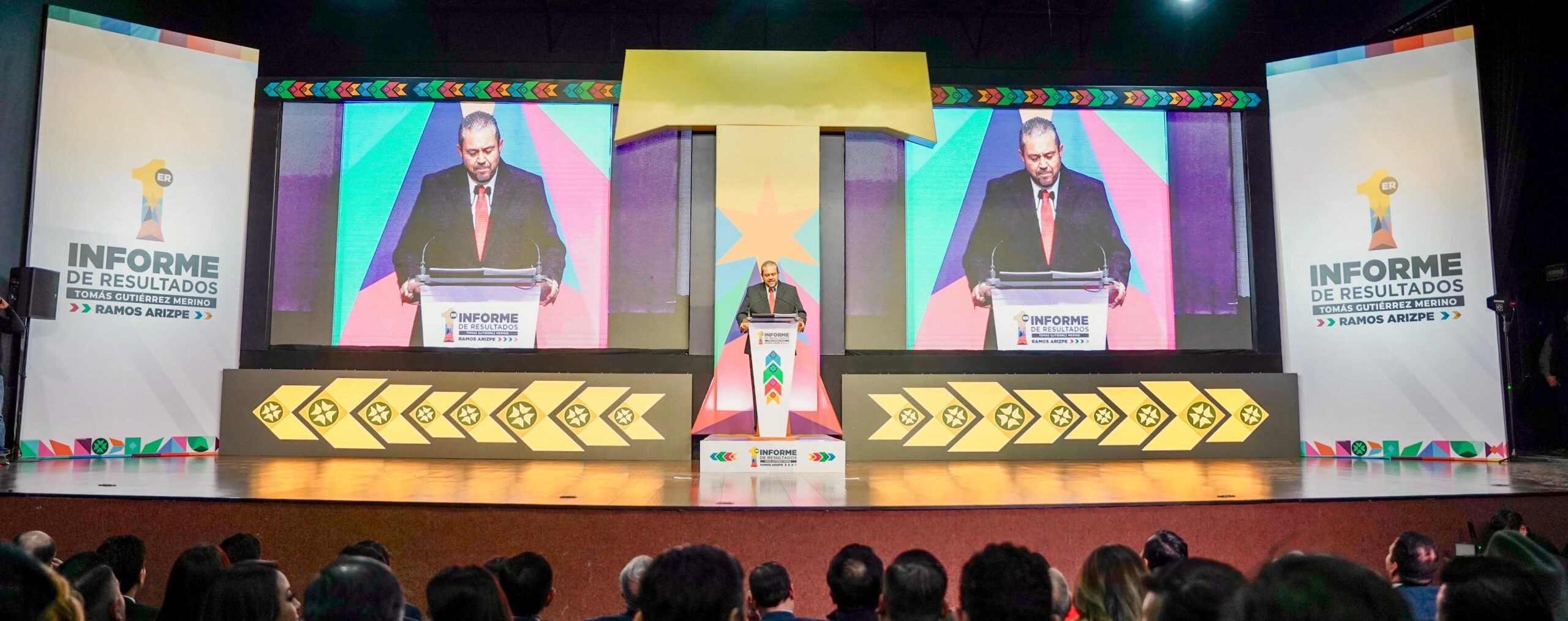 Con el acompañamiento del gobernador Manolo Jiménez Salinas, el alcalde Tomás Gutiérrez Merino presentó este lunes su Primer Informe de Resultados ante ciudadanos, empresarios, diputados locales y federales, campesinos, autoridades estatales, municipales y representantes de la región sureste, en el Teatro de la Ciudad Eulalio Gutiérrez Ortiz, el cual lució a su máxima capacidad.