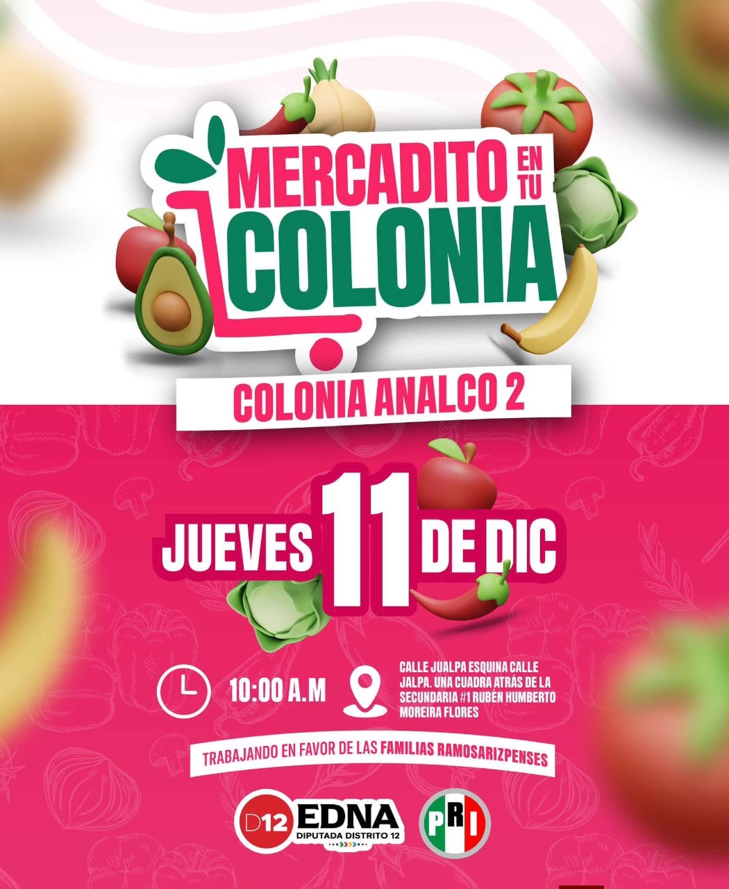 Con el objetivo de apoyar la economía familiar y acercar productos de la canasta básica a precios accesibles, este jueves 11 de diciembre se llevará a cabo una nueva edición del programa “Mercadito en tu Colonia”, ahora en la colonia Analco II en Ramos Arizpe. La jornada iniciará a las 10:00 horas en calle Jualpa esquina con calle Jalpa, a una cuadra de la Secundaria #1 ‘Rubén Humberto Moreira Flores’.