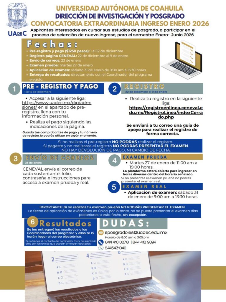 Para más información, comunicarse a la Dirección de Investigación y Posgrado a los teléfonos (844) 410 02 78, (844) 412 90 94, al WhatsApp (844) 543 10 40 o al correo sposgradoies@uadec.edu.mx.