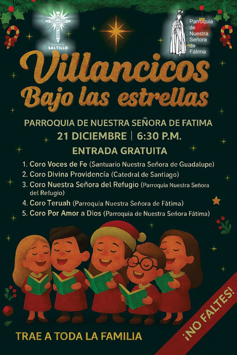 Con un programa musical que busca celebrar la tradición y el espíritu navideño, la parroquia de Nuestra Señora de Fátima, en Saltillo, anunció la realización del concierto “Villancicos Bajo las Estrellas”, que se llevará a cabo el 21 de diciembre de 2025, a las 6:30 de la tarde, con acceso gratuito para todo el público.