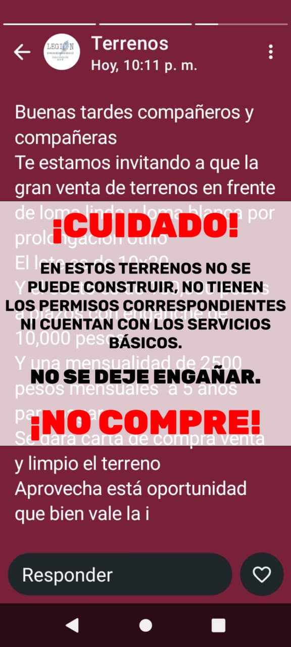 De acuerdo con la información detectada, se promueve la venta de lotes de 10 por 20 metros, con un costo aproximado de 150 mil pesos, solicitando un enganche de 10 mil pesos y pagos mensuales de 2 mil 500 pesos, lo cual representa un riesgo para quienes pretendan adquirirlos.