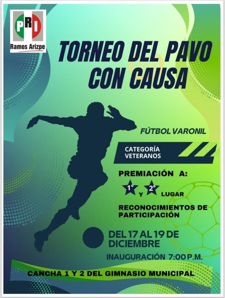 El Comité Directivo Municipal del Partido Revolucionario Institucional (PRI) en Ramos Arizpe, lanzó una invitación a la militancia, simpatizantes y ciudadanía en general para participar en el Torneo del Pavo 2025, en la categoría Varonil Veteranos, un evento deportivo que busca fortalecer la unidad partidista y, al mismo tiempo, apoyar a quienes más lo necesitan.