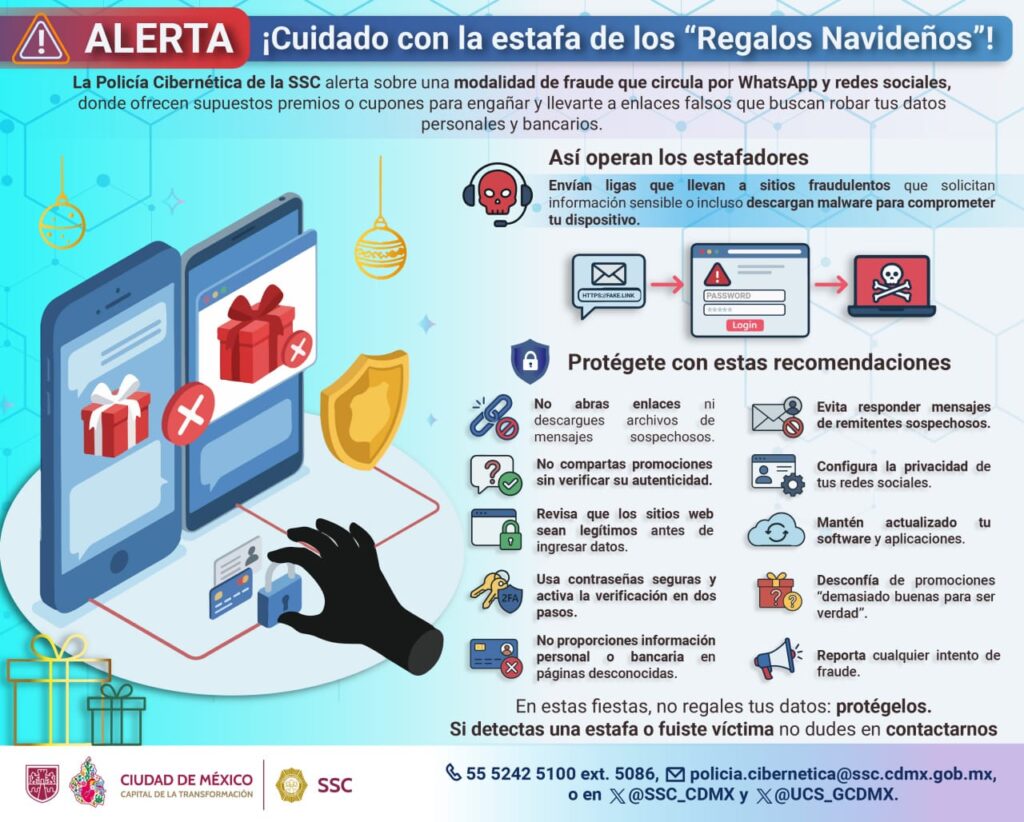 Ciudad de México.- La Unidad de Policía Cibernética, de la Secretaría de Seguridad Ciudadana (SSC) de la Ciudad de México, alertó a la ciudadanía por una nueva forma de fraude en circulación identificada como “Regalos Navideños”, así como aquellas que buscan robar el aguinaldo de los usuarios.