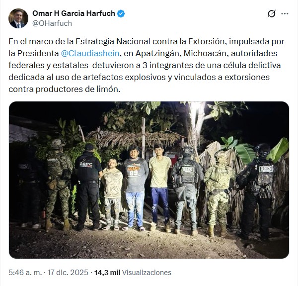“En el marco de la Estrategia Nacional contra la Extorsión, impulsada por la Presidenta @Claudiashein, en Apatzingán, Michoacán, autoridades federales y estatales detuvieron a 3 integrantes de una célula delictiva dedicada al uso de artefactos explosivos y vinculados a extorsiones contra productores de limón”, informó el funcionario en su cuenta @OHarfuch. (AGENCIA REFORMA)
