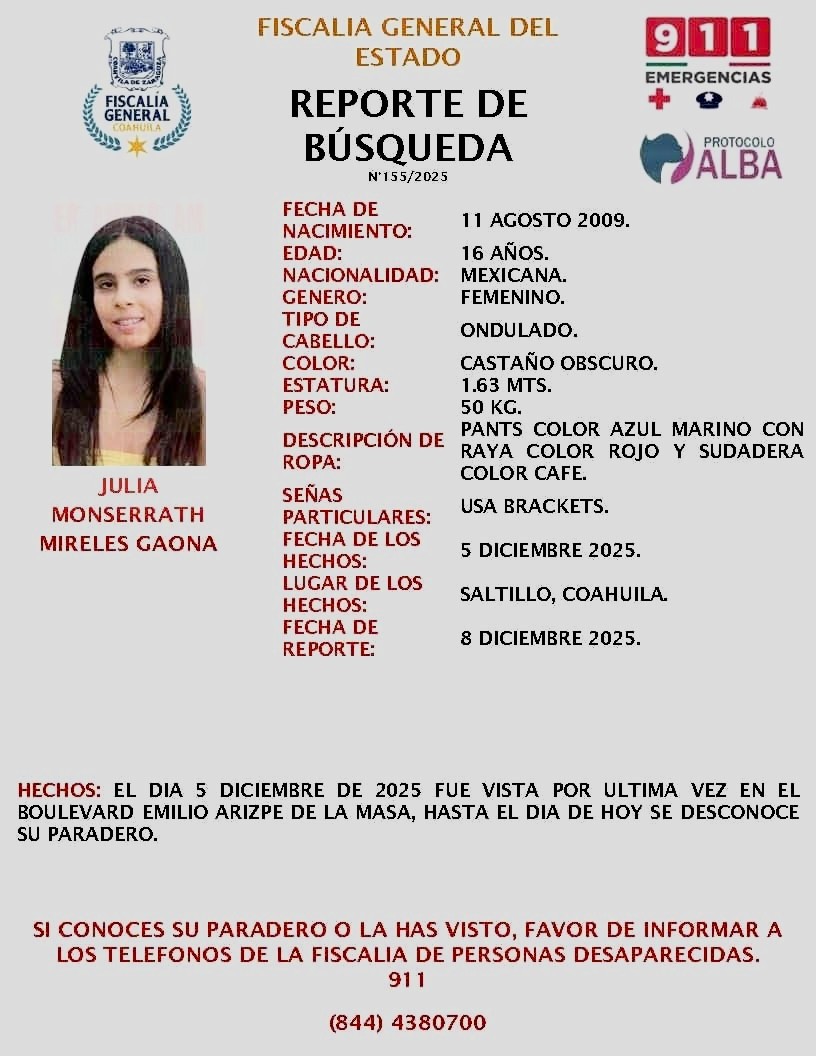 La Fiscalía de Personas Desaparecidas del Estado de Coahuila, Región Sureste, solicitó el apoyo de la ciudadanía para dar con el paradero de Julia Monserrath Mireles Gaona, de 16 años de edad, quien fue reportada como persona no localizada en Saltillo.