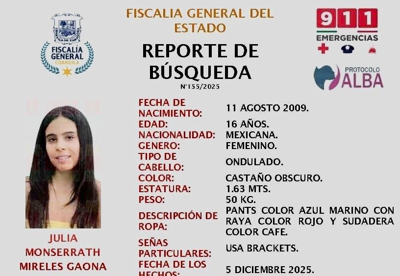 Piden apoyo ciudadano para localizar a menor desaparecida en Saltillo