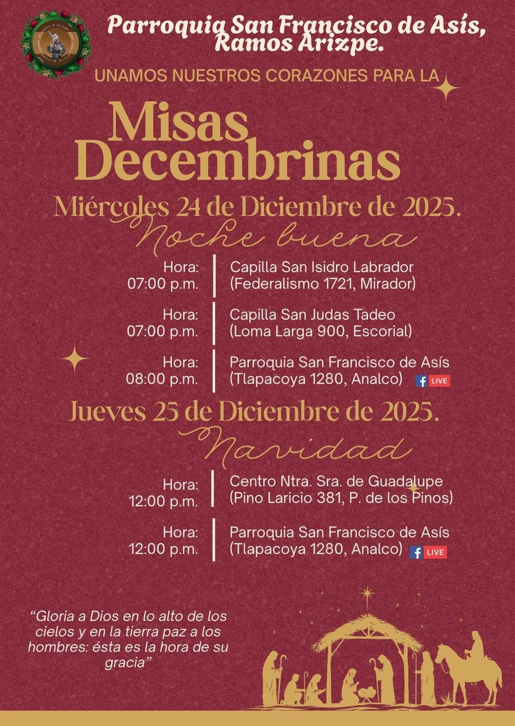 La Parroquia San Francisco de Asís, en Ramos Arizpe, dio a conocer los horarios de las misas decembrinas que se celebrarán con motivo de la Nochebuena y la Navidad, invitando a la feligresía a unirse en oración y reflexión en estas fechas previas a concluir el año.