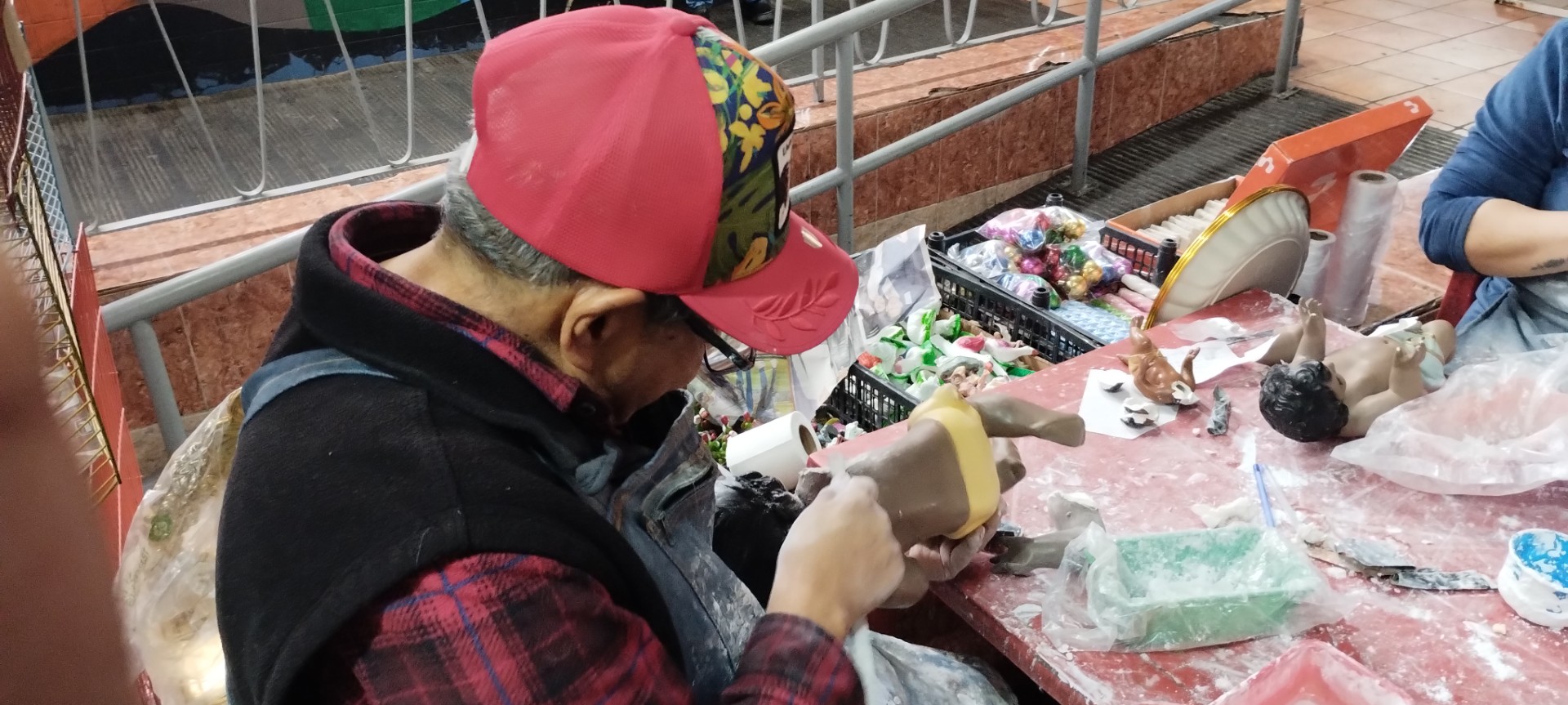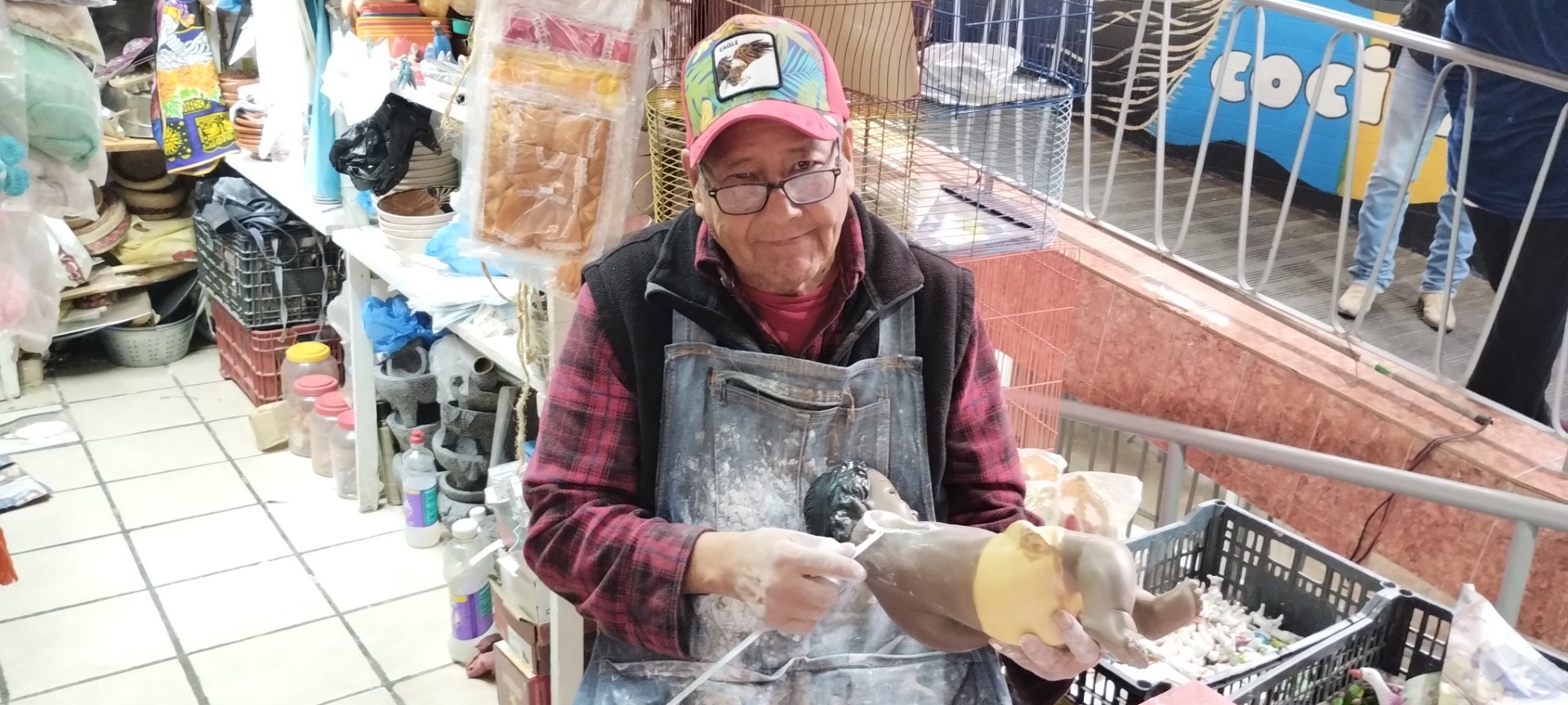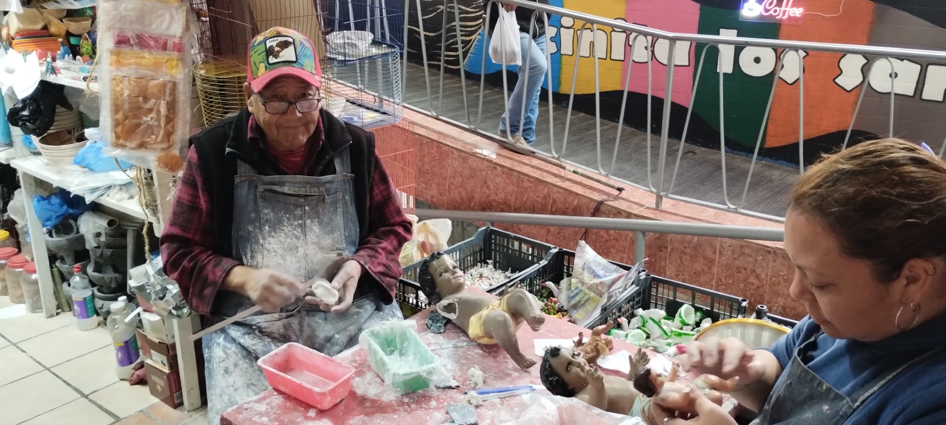 “Tenemos ya en esto 50 años, desde que se inauguró el mercado, en ese tiempo trabajaba con mi papá, él vendía barro pero de repente nos ponía a pegar algunas piezas que llegaban a quebrarse, aprendimos a repararlas y a resanarlas, a partir de allí comenzamos en esta actividad. Nos llegan imágenes en todo el año, no nada más ahorita en diciembre, aunque a fin de año es la temporada más fuerte, diciembre y enero es cuando hay más trabajo”, señala.