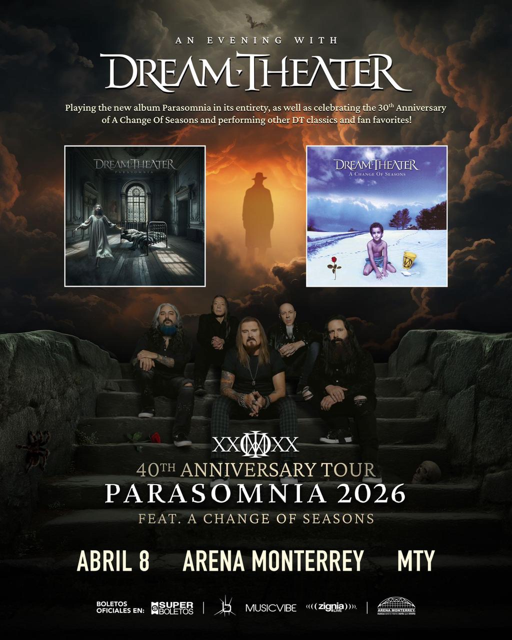 La cita es el miércoles 8 de abril de 2026 a las 9:00 p.m y el evento se llevará a cabo en la Arena Monterrey, en donde los fanáticos podrán escuchar en vivo el más reciente álbum de la banda “Parasomnia”, además de celebrar los 30 años de “A Change Of Seasons”.