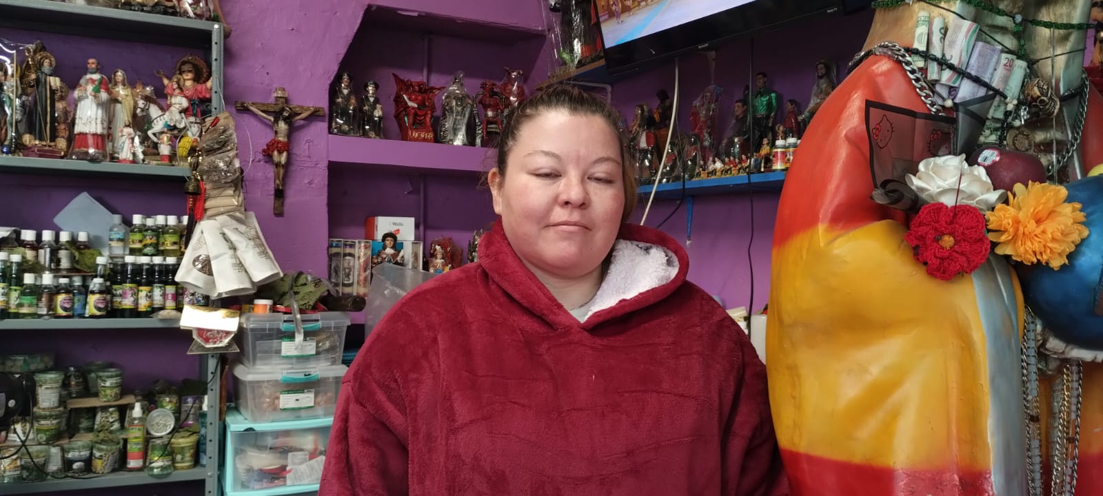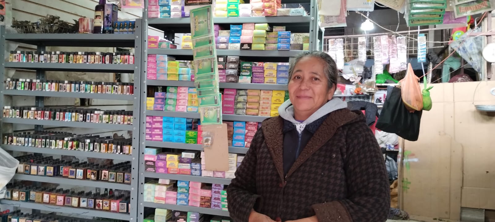 “Ha bajado la venta, para estas fechas ya había mucha gente comprando los baños, las velas, inciensos para sanar toda la casa, están los baños espirituales, de hierbas para quitar toda la mala vibra, envidia, para despojarse de todo lo negativo y atraer la abundancia y la prosperidad”, señala la entrevistada.