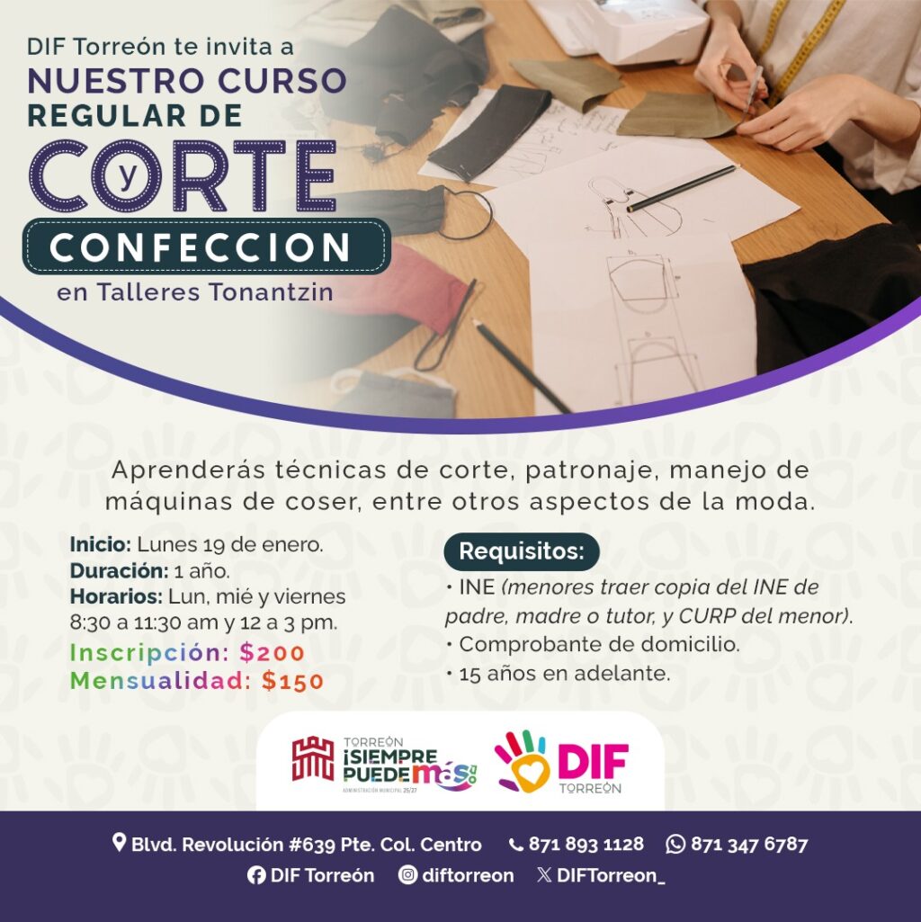 Torreón, Coahuila.- El Sistema para el Desarrollo Integral de la Familia (DIF) Torreón invita a la población a inscribirse en el curso regular de corte y confección, en el cual las y los participantes aprenderán técnicas de corte, patronaje, manejo de máquinas de coser y otros conocimientos básicos relacionados con el diseño y la moda, que les permitirán desarrollar habilidades productivas.