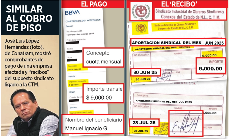 Mostró recibos membretados del presunto sindicato -en los que aparece el logo de la CTM- con el pago que hace mensualmente uno de los agremiados. El dinero se deposita a una cuenta de BBVA, a nombre de Manuel Ignacio G.