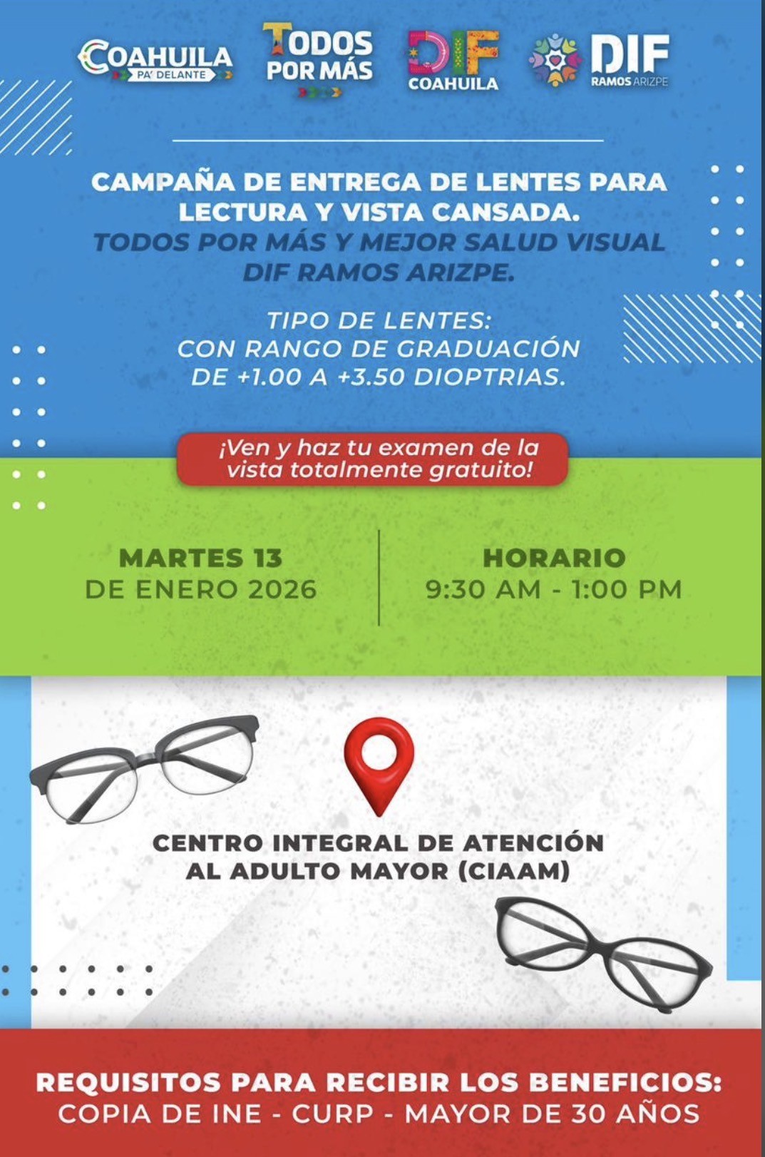 Con el objetivo de fortalecer la salud visual de la población, el DIF Municipal de Ramos Arizpe llevará a cabo una campaña de entrega de lentes para lectura y vista cansada, como parte del programa “Todos por Más y Mejor Salud Visual”, dirigida a personas mayores de 30 años.