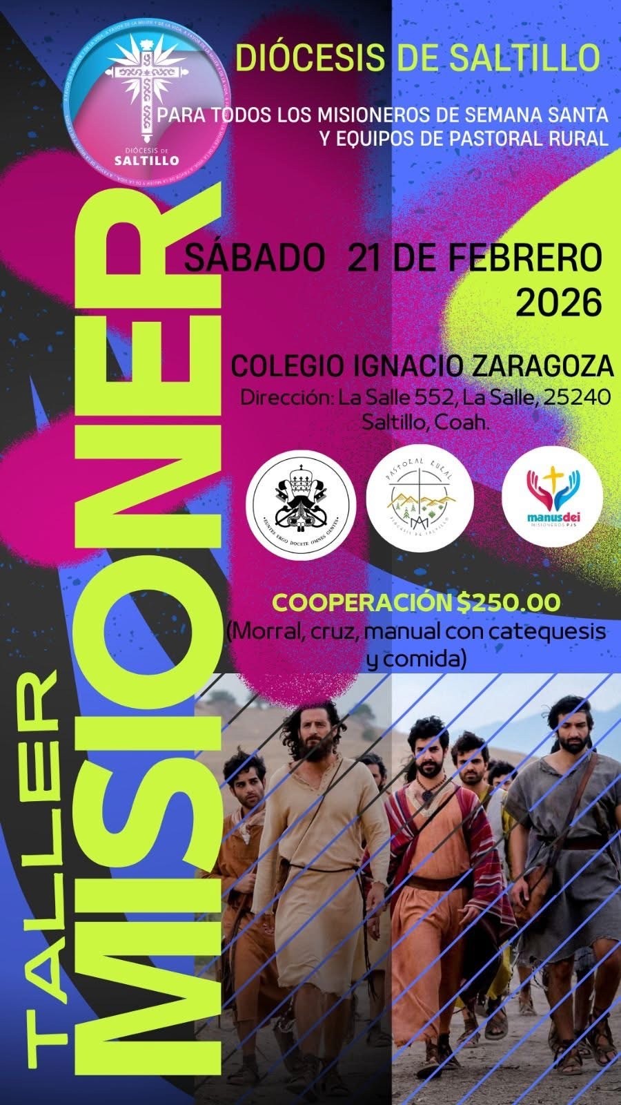 El taller se llevará a cabo el sábado 21 de febrero, en las instalaciones del Colegio Ignacio Zaragoza, ubicado en La Salle #552, en la colonia La Salle, en Saltillo, y tiene como objetivo fortalecer la formación espiritual y pastoral de quienes participarán en las misiones, especialmente en comunidades rurales.