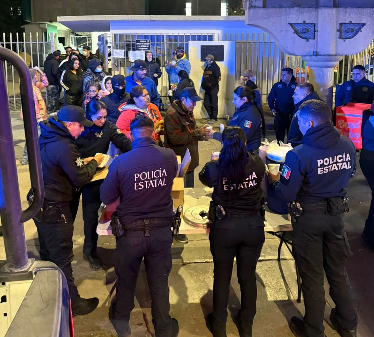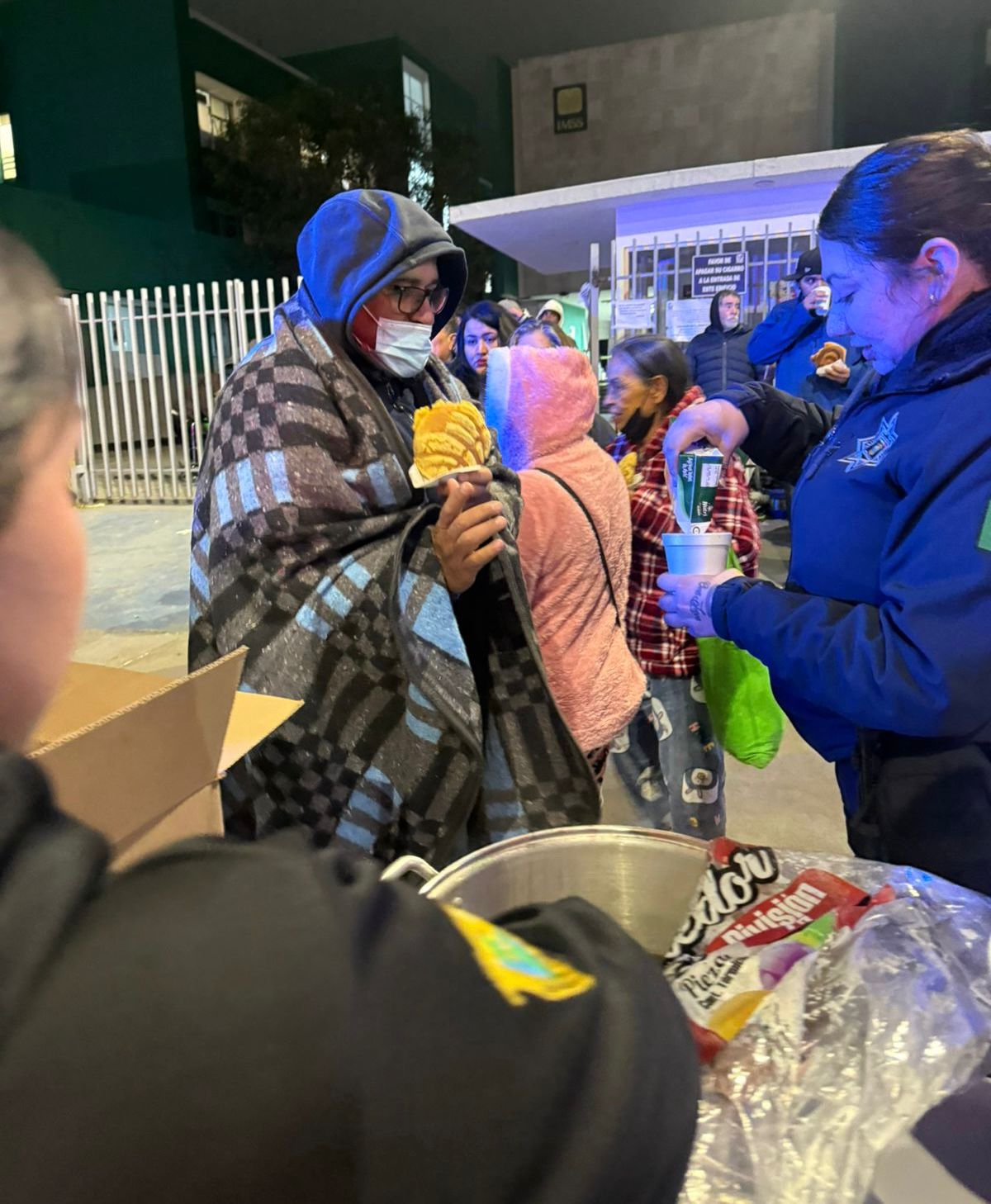 La Policía Estatal de Coahuila apoyó con bebidas calientes y pan a personas que se encontraban en espera de sus familiares a las afueras de diversos hospitales de Saltillo.