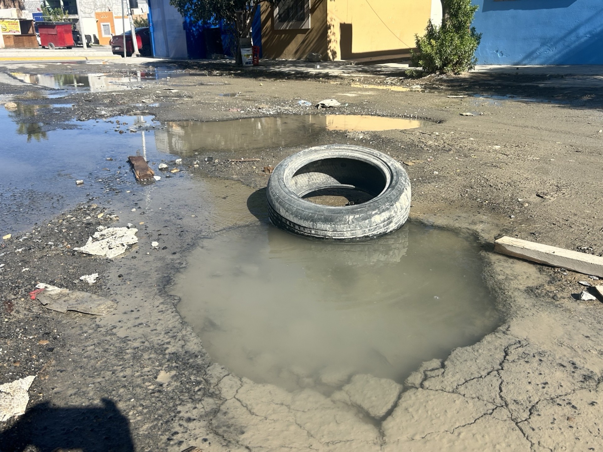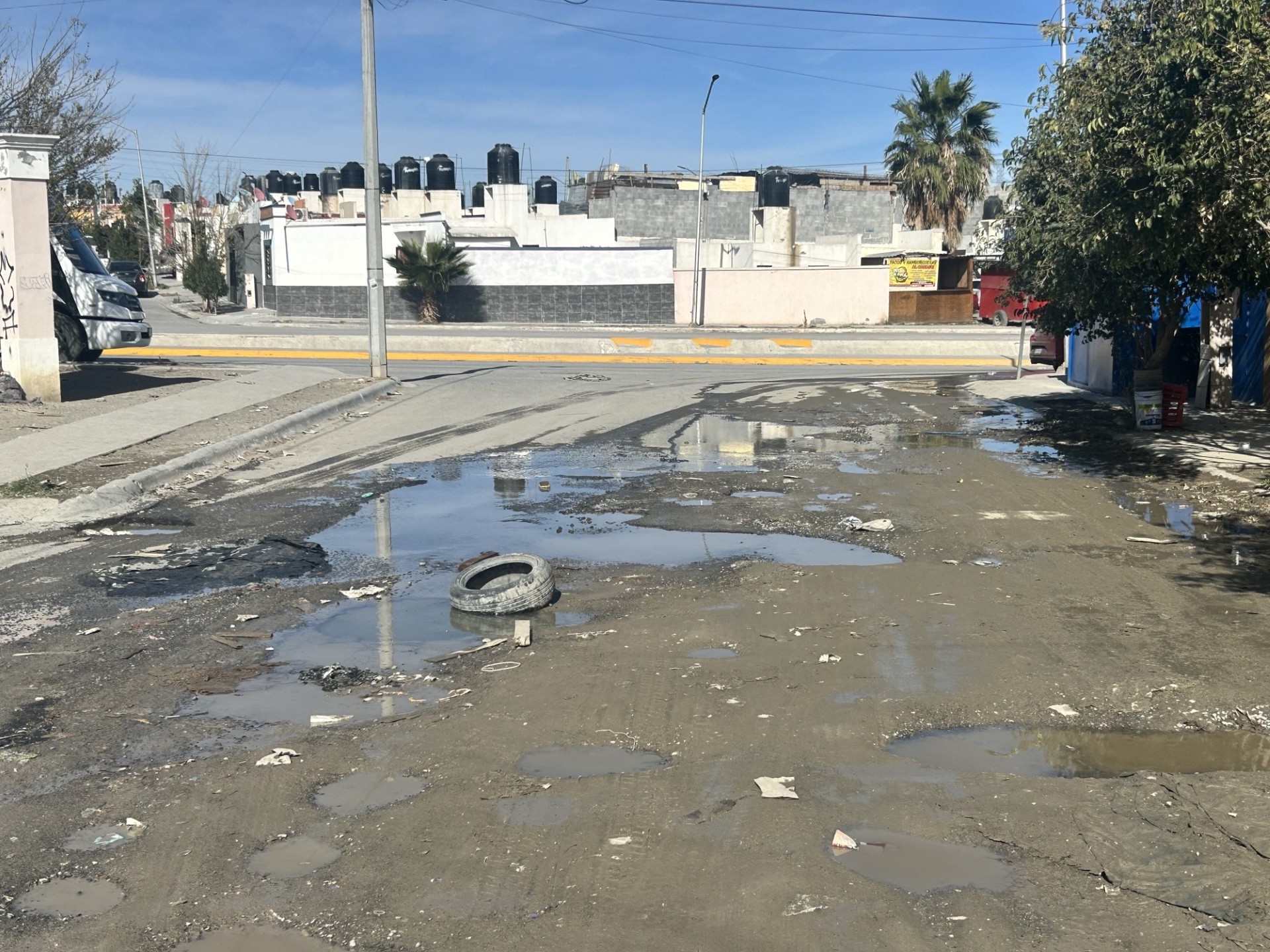 De acuerdo con el reporte ciudadano, la situación se presenta en la entrada de la calle Pino Caribe, donde el agua residual permanece acumulada, afectando el tránsito y las condiciones sanitarias de la zona.