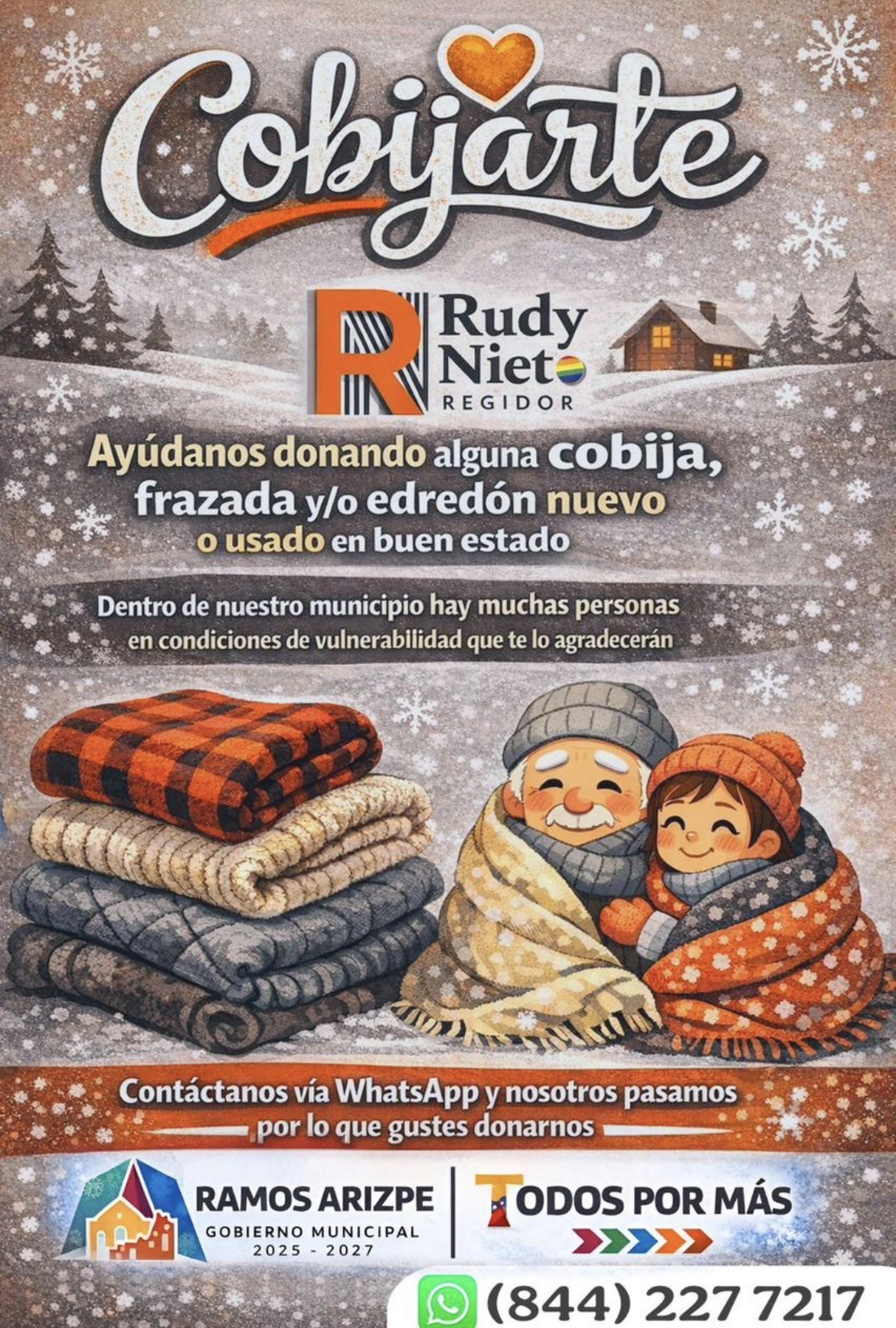 Con el objetivo de brindar abrigo y solidaridad a quienes más lo necesitan durante la temporada invernal, en Ramos Arizpe se puso en marcha la campaña “Cobijarte”, mediante la cual se invita a la ciudadanía a donar cobijas, frazadas y/o edredones, ya sean nuevos o en buen estado, para apoyar a personas en condiciones de vulnerabilidad dentro del municipio.