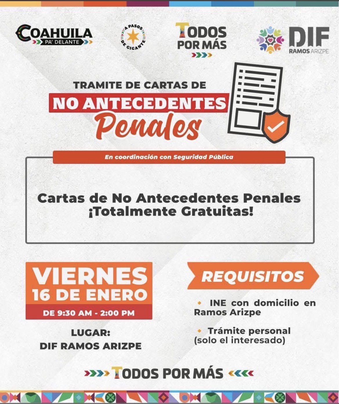 El DIF de Ramos Arizpe, en coordinación con Seguridad Pública, invitó a la ciudadanía a aprovechar la jornada gratuita de trámite de cartas de No Antecedentes Penales, que se llevará a cabo el viernes 16 de enero, en un horario de 9:30 a 14:00 horas, en las instalaciones del DIF Municipal.