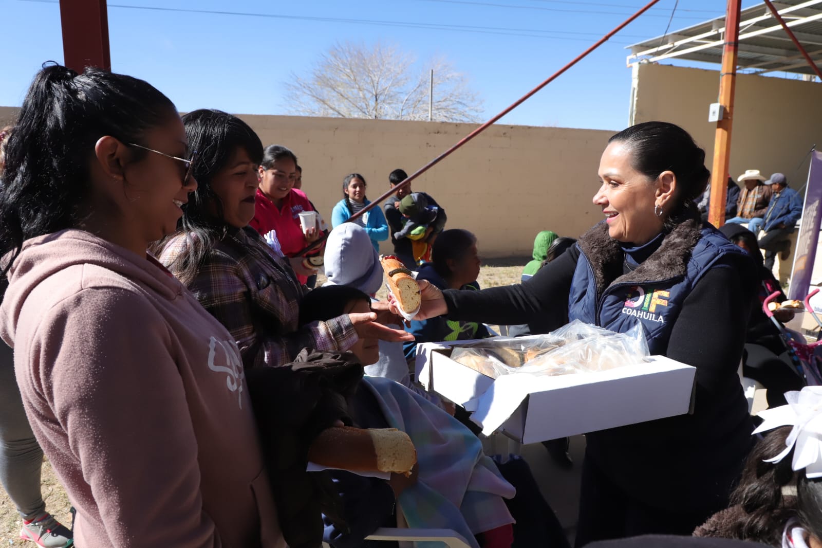 Durante su visita a la comunidad de Hércules, en el municipio de Sierra Mojada, el DIF Coahuila llevó apoyos directos a la población, beneficiando a niñas, niños, personas adultas mayores y familias en general con la entrega de juguetes, pan, chocolate caliente, despensas y cobijas, fortaleciendo la cercanía institucional y el tejido social en estas localidades.