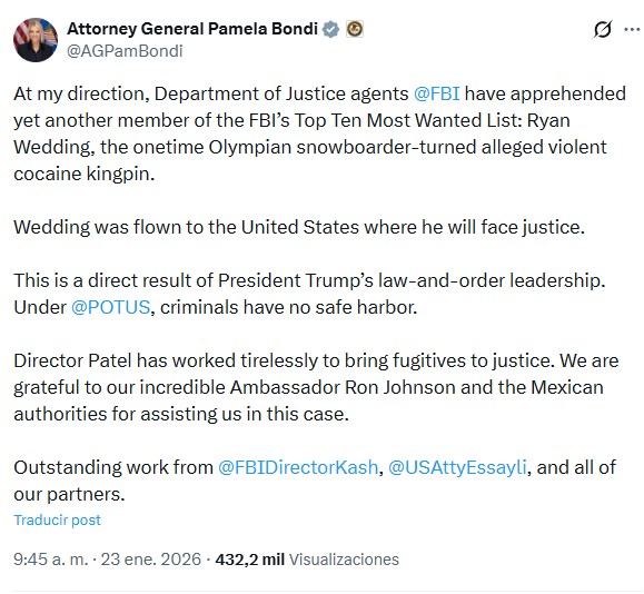Ryan James Wedding, de 44 años, figuraba entre los diez fugitivos más buscados por el Buró Federal de Investigaciones (FBI) por quien se daba una recompensa de 15 millones de dólares y era señalado como el líder de una red transnacional responsable de introducir alrededor de 60 toneladas de cocaína al año en Los Ángeles mediante camiones semirremolque procedentes de México, Canadá y Colombia, según lo declarado previamente por la fiscal general de Estados Unidos, Pam Bondi.