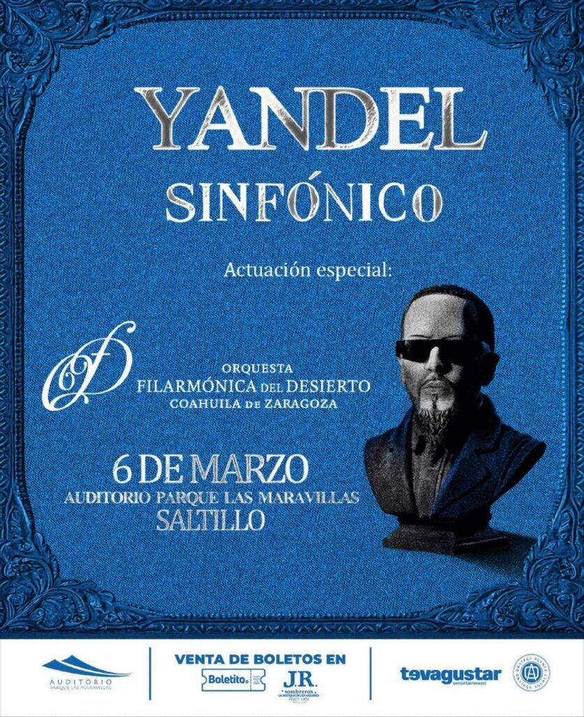 El evento se llevará a cabo el viernes 6 de marzo en el Auditorio Parque Las Maravillas y la orquesta sinfónica que acompañará a Yandel en esta fecha, se trata nada más y nada menos que de la Filarmónica del Desierto de Coahuila de Zaragoza, quienes se encargarán de las instrumentales en cada canción.