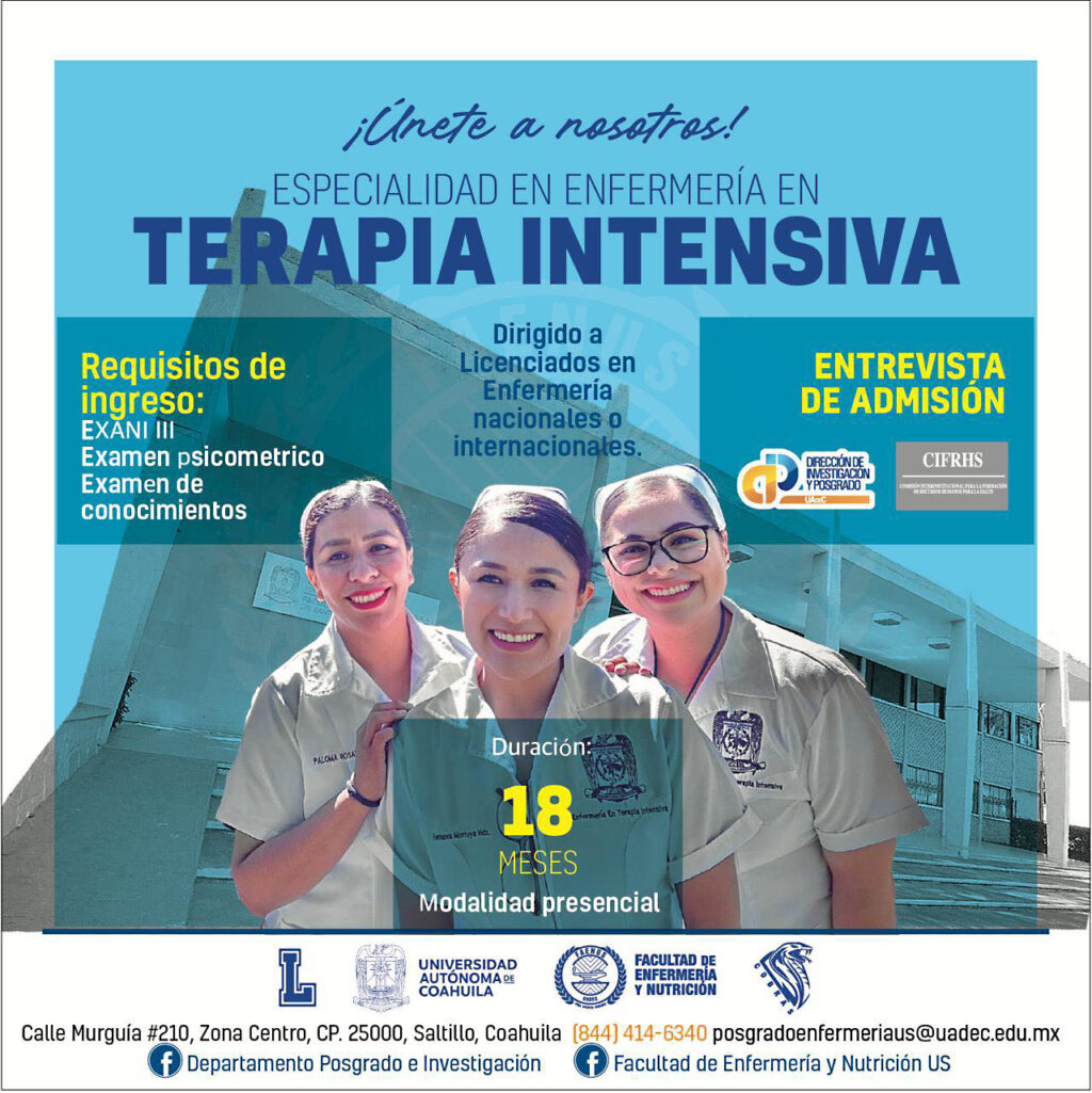 La Universidad Autónoma de Coahuila a través de la Facultad de Enfermería “Dr. Santiago Valdés Galindo” Unidad Sureste, ofrece la Especialidad de Enfermería en Terapia Intensiva, la cual está dirigida a Licenciados en Enfermería nacionales e internacionales y cuyas clases inician en agosto de 2026.