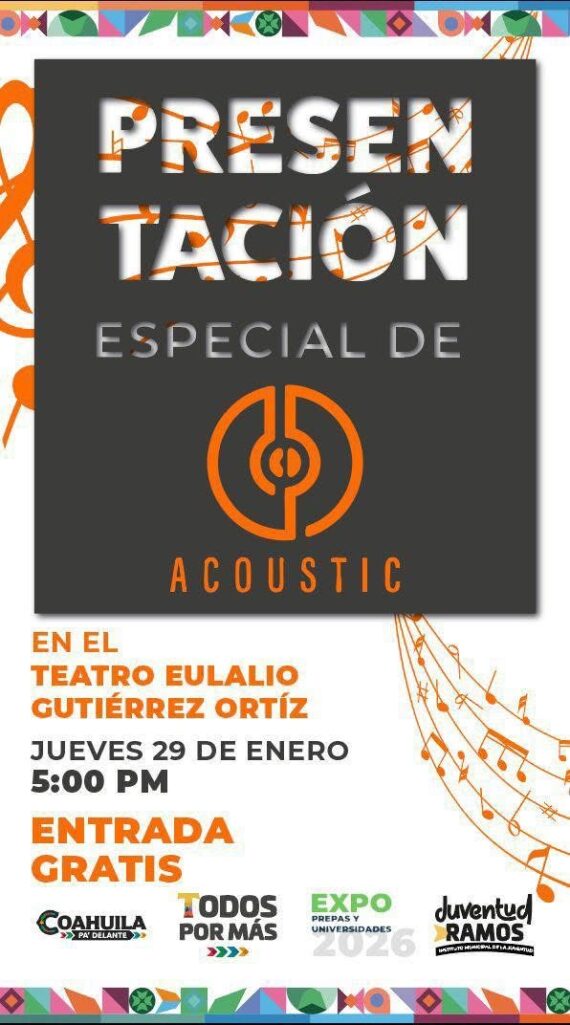 Como parte de las actividades artísticas y culturales dirigidas a la juventud y a las familias de Ramos Arizpe, este jueves 29 de enero se llevará a cabo una presentación especial del proyecto musical “Acoustic”, espectáculo gratuito que promete una tarde de talento local y ambiente relajado en formato acústico, con entrada completamente gratuita.