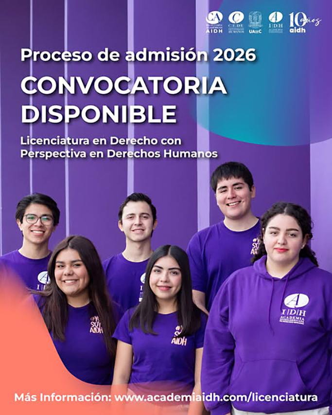 La Academia Interamericana de Derechos Humanos (AIDH) de la Universidad Autónoma de Coahuila, convoca a estudiantes que hayan concluido estudios de Bachillerato interesados en cursar la Licenciatura en Derecho con Perspectiva en Derechos Humanos, cuyas clases iniciarán en agosto de 2026.