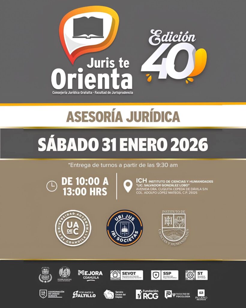 Para acercar servicios jurídicos a la población y fortalecer la formación práctica de sus estudiantes, alumnos y docentes de la Facultad de Jurisprudencia de la Universidad Autónoma de Coahuila (UA de C) llevarán a cabo la primera edición de este 2026 del programa “Juris Te Orienta”, mediante el cual se ofrecerá asesoría legal gratuita a la ciudadanía que lo requiera.