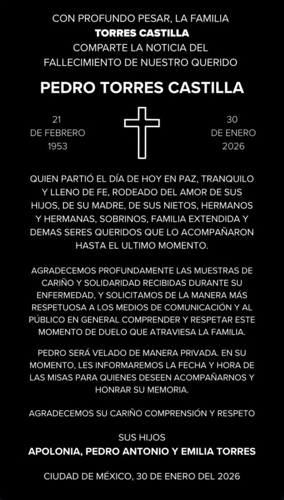Aunque en el mensaje no se precisó la causa del deceso, Torres Castilla padecía Esclerosis Lateral Amiotrófica (ELA), enfermedad degenerativa que deteriora progresivamente las funciones motoras. En diciembre de 2025, su hijo Pedro Antonio dio a conocer que el productor se encontraba delicado, aunque estable. Originario de Saltillo, Pedro Torres se consolidó como una de las figuras más influyentes en la industria audiovisual de México.