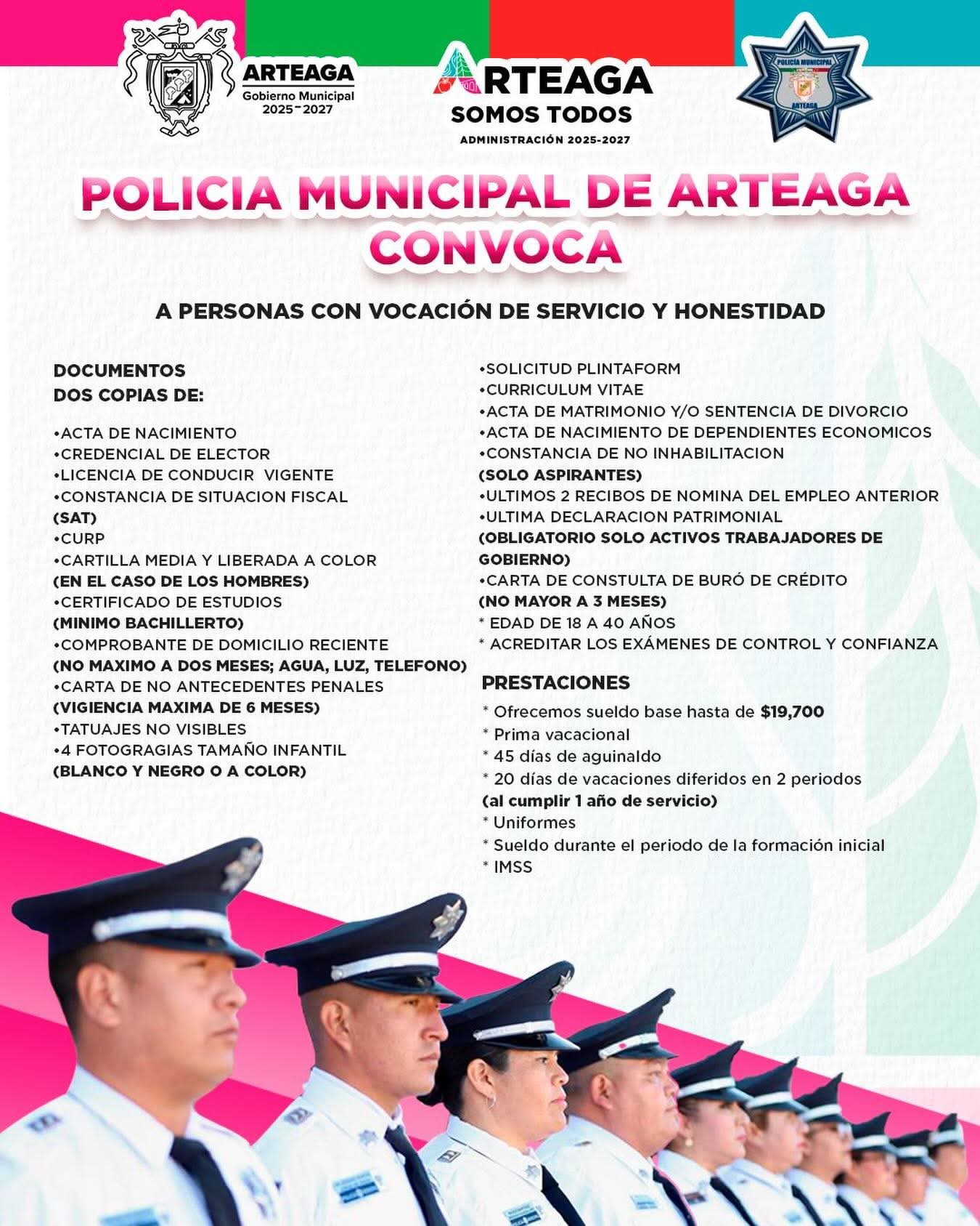 Durante febrero de este 2026 continúa abierta la convocatoria para formar parte de la Policía Municipal de Arteaga, dirigida a mujeres y hombres interesados en incorporarse a labores de seguridad pública bajo principios de servicio, responsabilidad y honestidad.