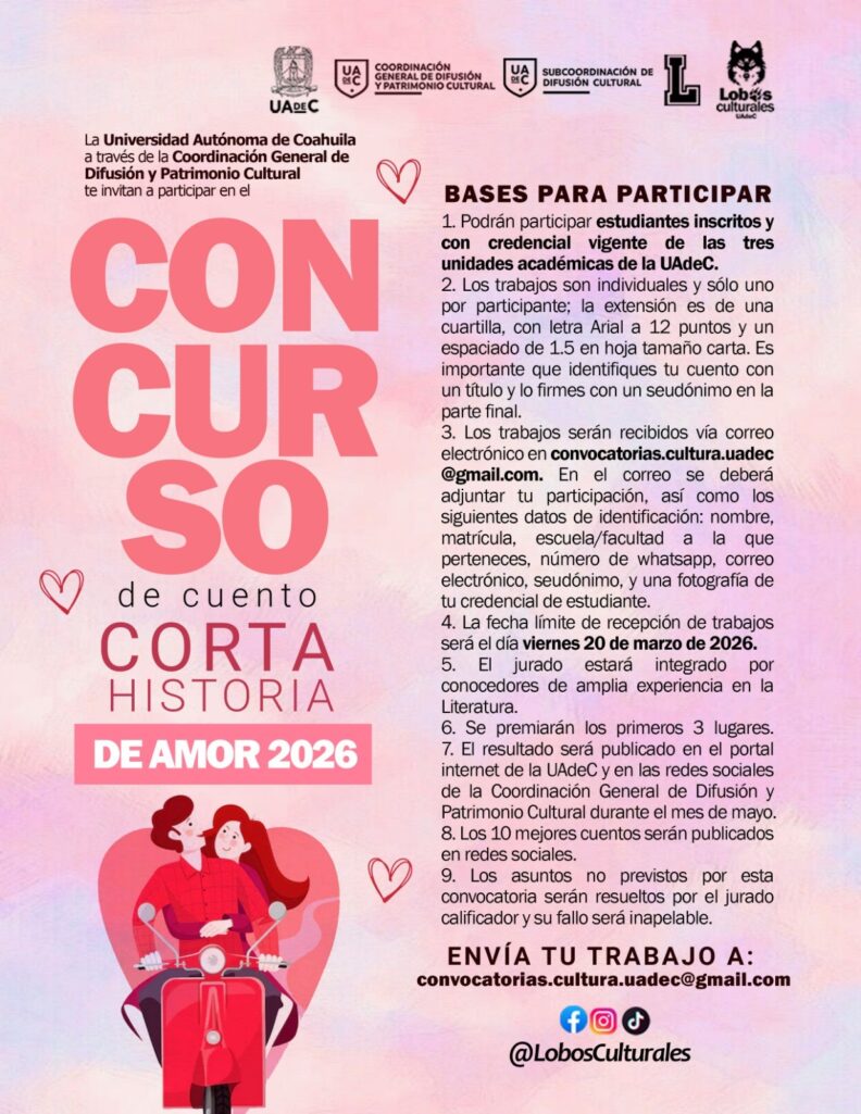 La Universidad Autónoma de Coahuila a través de la Coordinación General de Difusión y Patrimonio Cultural, invita a sus estudiantes inscritos y con credencial vigente de las tres unidades académicas a participar en el Concurso de Cuento “Corta Historia de Amor 2026”.