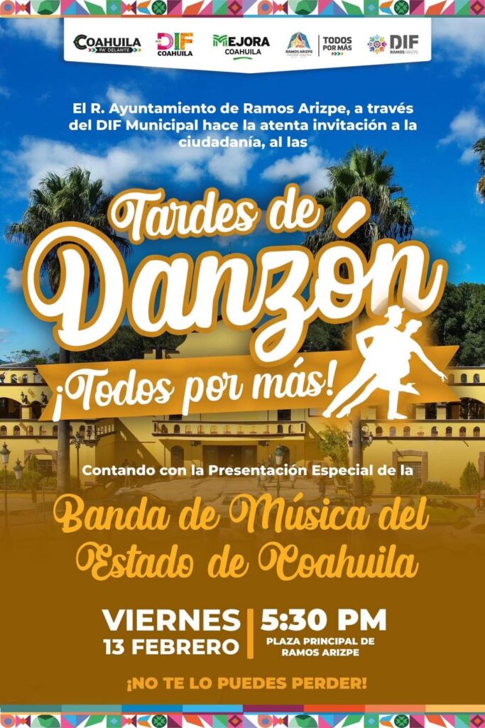 El Ayuntamiento de Ramos Arizpe, a través del DIF Municipal, lanzó la invitación a la ciudadanía para participar en una nueva edición de las “Tardes de Danzón ¡Todos por más!”, evento gratuito que reunirá a decenas de familias en la Plaza Principal, actividad que tiene como fin fomentar la convivencia familiar y mantener vivas las tradiciones musicales que forman parte de la identidad regional.