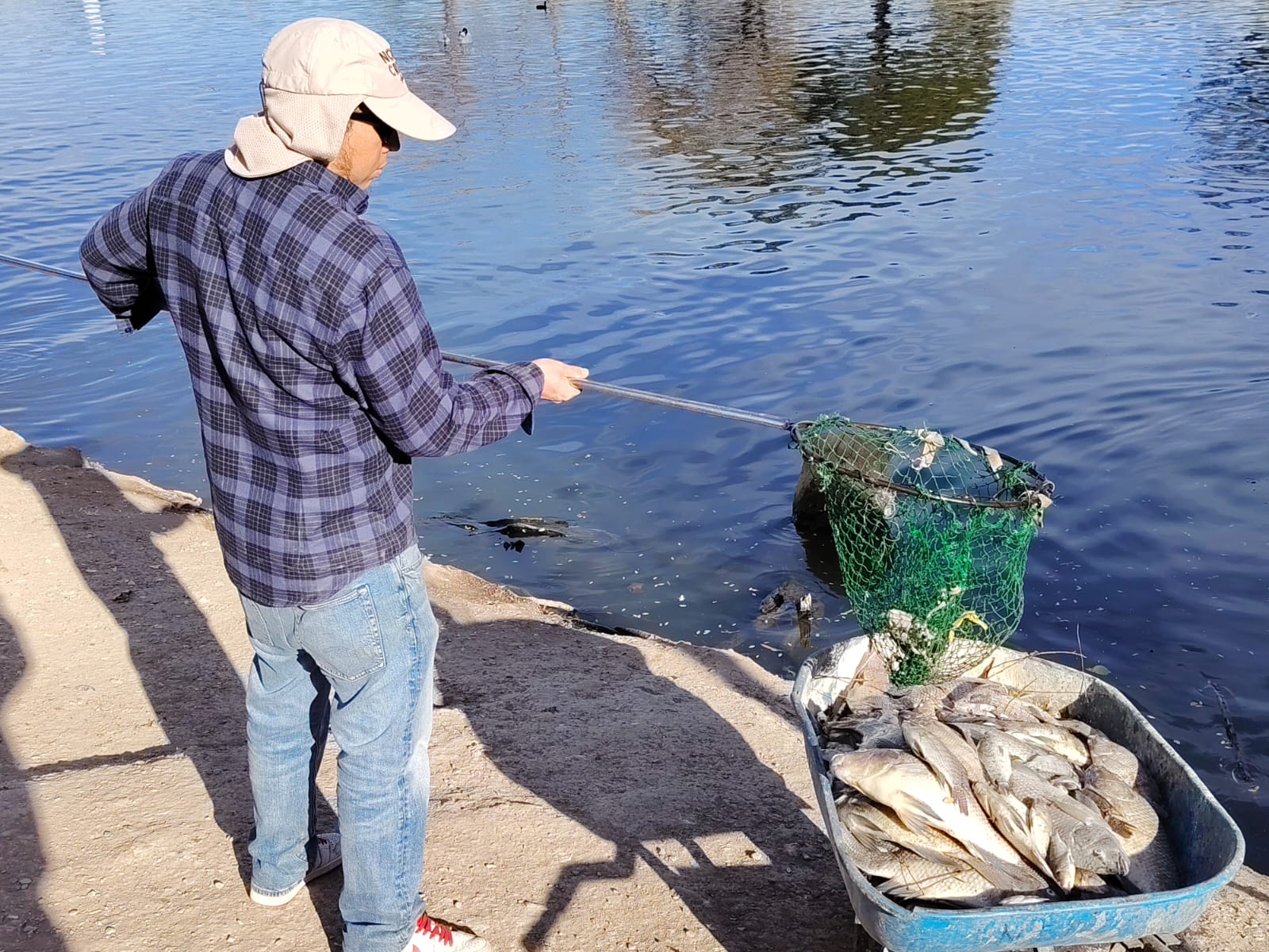 Con todo y la alta afluencia de visitantes que se registró este domingo en la Ciudad Deportiva de Saltillo, un grupo de trabajadores continúa con las labores de extracción de peces muertos en el lago de ese espacio recreativo, donde desde hace algunos días continúa esta problemática derivada, al parecer, de la falta de oxígeno en el agua, según manifestaron los propios encargados de la limpieza de ese cuerpo de agua.