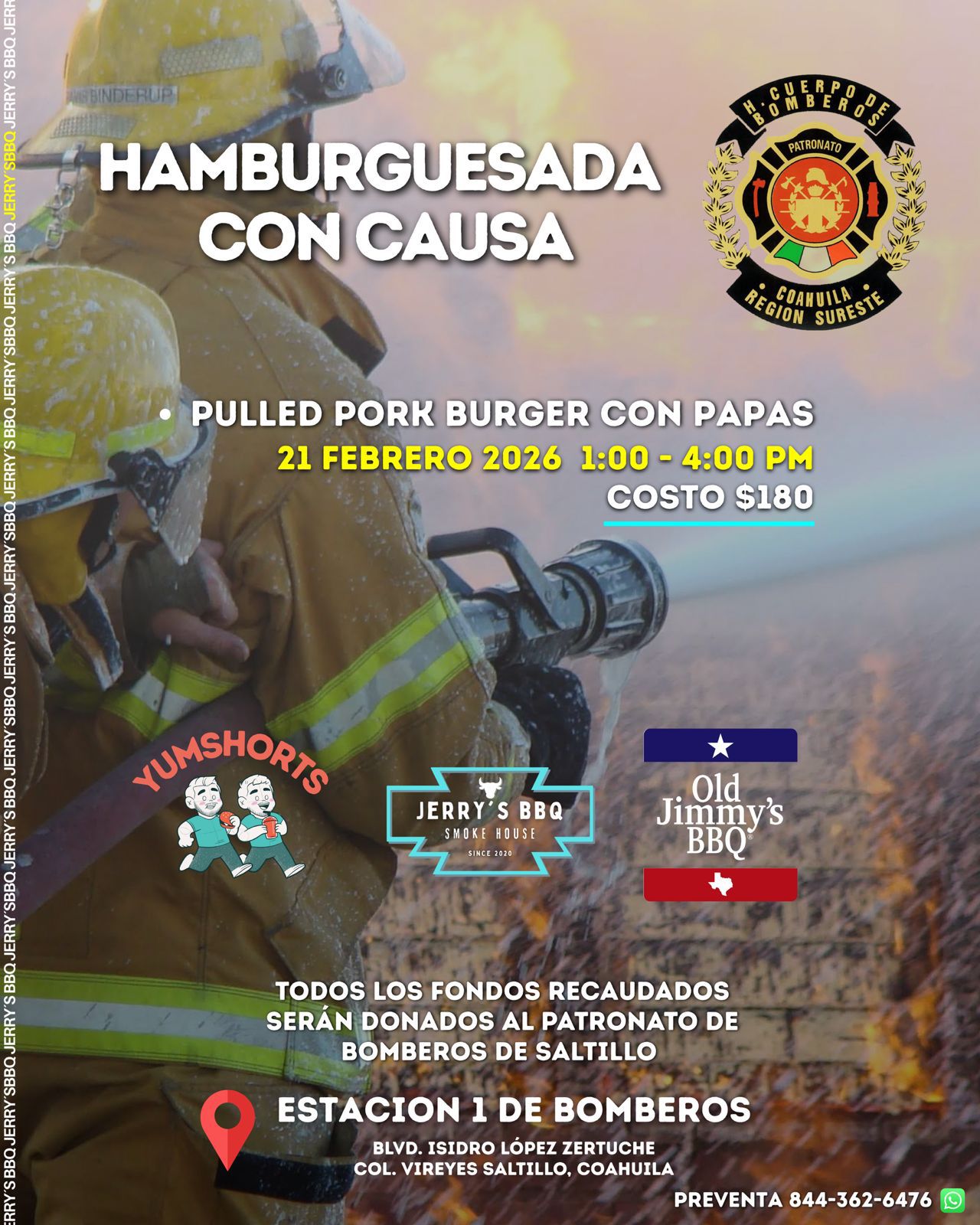 Este sábado 21 de febrero se llevará  a cabo en instalaciones de la Estación 1 de Bomberos que se ubica en el bulevar Isidro López Zertuche de la colonia Virreyes  una “hamburguesada” con el objetivo de apoyar la labor del Patronato de Bomberos de Saltillo, que a su vez, destinará los fondos recaudados a la adquisición de material y equipo para el Cuerpo de Bomberos.