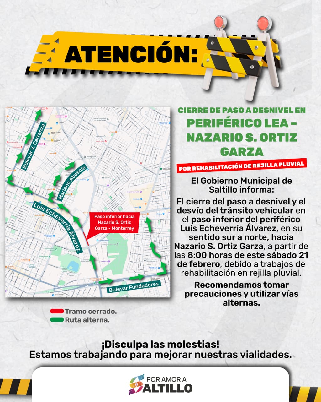 El Gobierno Municipal de Saltillo informó que este sábado 21 de febrero se cerrará el paso a desnivel en el periférico Luis Echeverría Álvarez, en el sentido hacia el bulevar Nazario S. Ortiz Garza.