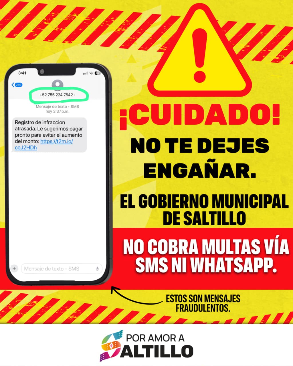 Por lo anterior, se exhorta a la ciudadanía a: no abrir enlaces incluidos en mensajes sospechosos, no proporcionar datos personales, bancarios o de identificación, no realizar pagos a través de sitios no oficiales, verificar cualquier información únicamente en los canales oficiales del Gobierno Municipal de Saltillo.
