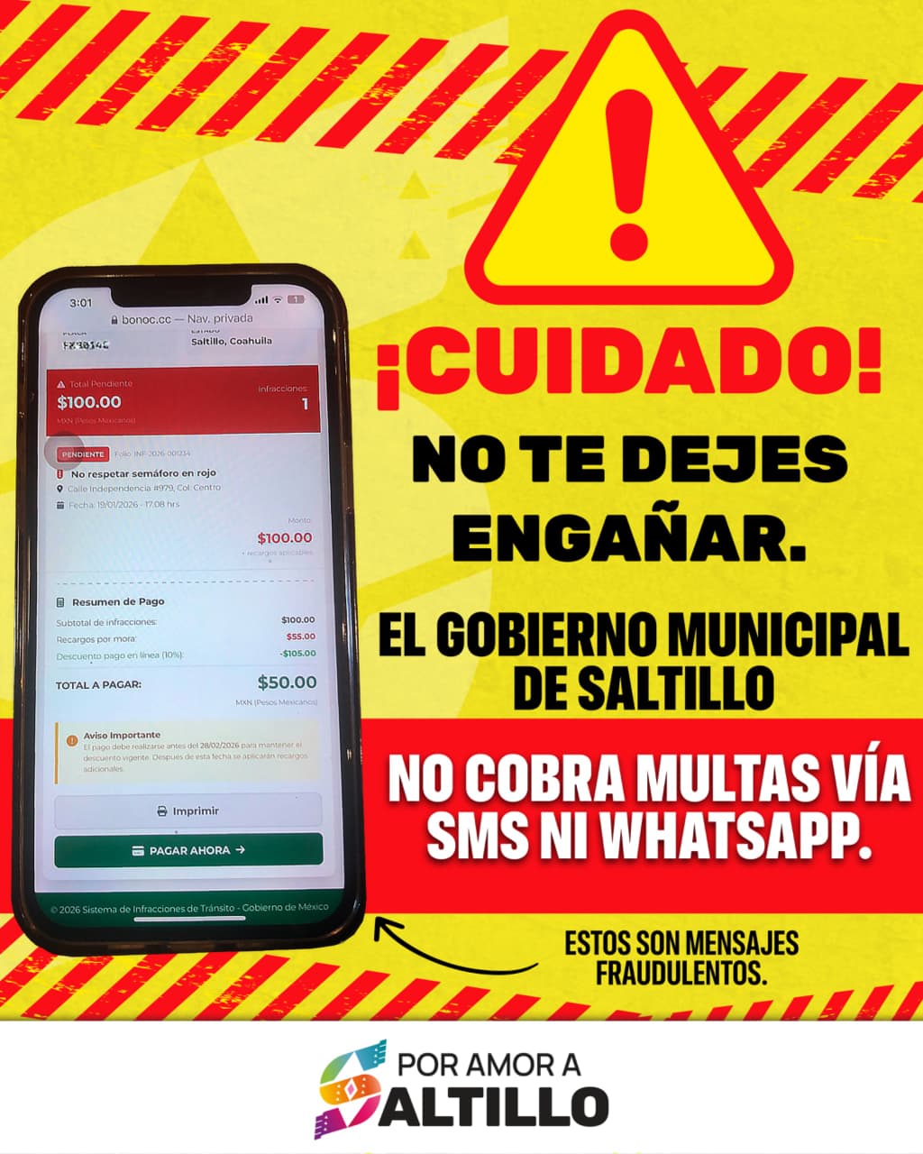 El Gobierno Municipal de Saltillo alerta a la población sobre el envío de mensajes de texto (SMS) fraudulentos en los que se informa sobre el cobro de supuestas infracciones de tránsito, invitando a la persona que recibe dicho mensaje a pagar la multa a través de una plataforma ajena al Gobierno Municipal.