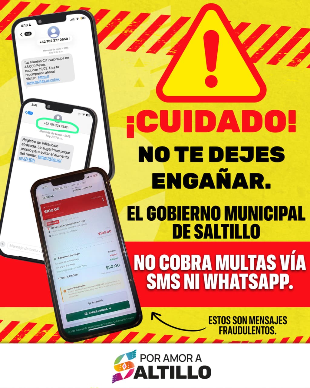Por lo anterior, se exhorta a la ciudadanía a: no abrir enlaces incluidos en mensajes sospechosos, no proporcionar datos personales, bancarios o de identificación, no realizar pagos a través de sitios no oficiales, verificar cualquier información únicamente en los canales oficiales del Gobierno Municipal de Saltillo.