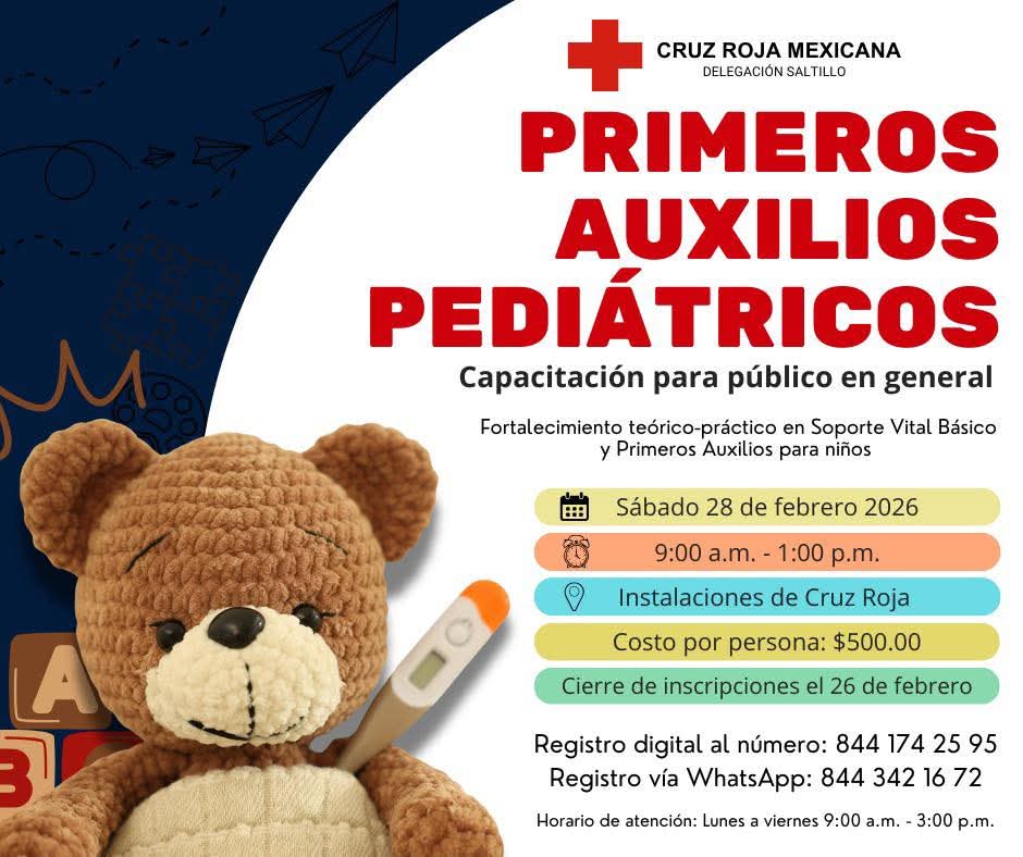 La delegación Saltillo de la Cruz Roja informó que el próximo sábado 28 de febrero, se impartirá en instalaciones de esa institución un curso de primeros auxilios pediátricos dirigido al público en general, con el objetivo de ofrecer los conocimientos necesarios a los participantes para que puedan actuar oportunamente en caso de presentarse algún accidente o emergencia en menores de cero a cinco años y logren salvar la vida de estos infantes.