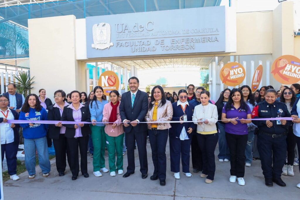 Torreón, Coahuila.- La Universidad Autónoma de Coahuila inauguró en la Unidad Laguna “Puntos Violeta” en Ciudad Universitaria Campus Torreón, la Escuela de Bachilleres Aguanueva “Ing. Aníbal Flores Neyra”, la Facultad de Enfermería, el edificio de la Coordinación Unidad Laguna, el Instituto de Enseñanza Abierta (IDEA) y el Instituto Manuel Muñoz Olivares (IMMO), espacios diseñados como zonas seguras y de resguardo para las mujeres en las instalaciones de la institución.