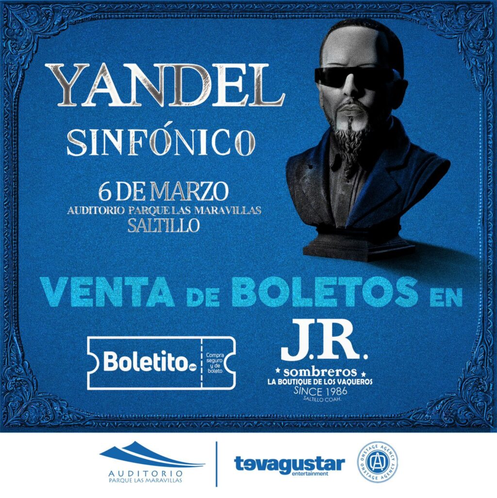 Yandel Sinfónico llegará a Saltillo el viernes 6 de marzo y el evento se llevará a cabo en el Auditorio Parque Las Maravillas. Las puertas abren a las 7:00 p.m y el evento comienza a las 8:00 p.m. El concepto de la gira es fusionar los grandes éxitos del reggaetón con el poder y la elegancia de una orquesta sinfónica en vivo. Para este evento se espera una asistencia de 7 mil personas.