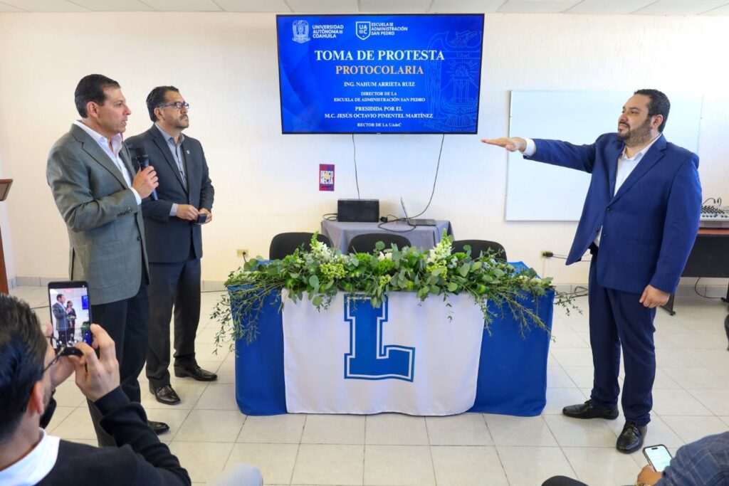 San Pedro, Coahuila.- El rector de la Universidad Autónoma de Coahuila, Octavio Pimentel Martínez, tomó protesta al ingeniero Nahum Arrieta Ruiz como director de la Escuela de Administración San Pedro de la Unidad Laguna, para el periodo 2026-2029.
