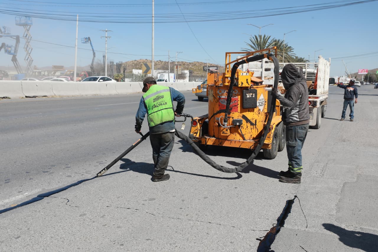 Además, como parte del mantenimiento preventivo para evitar fisuras y mayores daños en el asfalto, cuadrillas de Saltillo llevan a cabo el sellado de grietas en distintos tramos del pavimento del bulevar Venustiano Carranza.