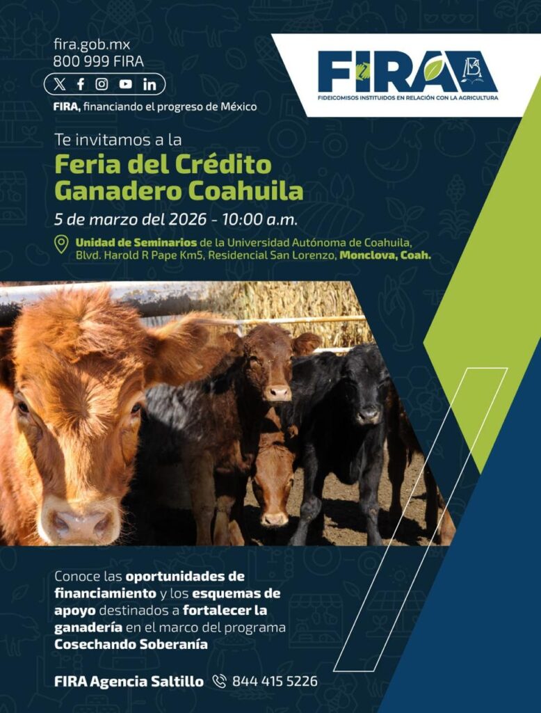 Para mayores informes, los interesados pueden comunicarse a la Agencia FIRA Saltillo al teléfono 844 415 5226 o consultar el sitio oficial fira.gob.mx, así como sus redes sociales institucionales.