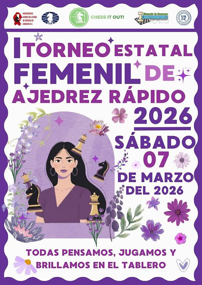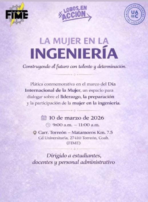 El Gobierno del Estado de Coahuila, a través de la Secretaría de Educación y en coordinación con el Instituto Estatal del Deporte de Coahuila y la Asociación de Ajedrez del Estado de Coahuila y en coordinación con la Coordinación de Deportes de la UA de C invitan al Torneo Estatal Femenil de Ajedrez Rápido 2026, las personas interesadas pueden inscribirse en el enlace: https://docs.google.com/forms/d/e/1FAIpQLScnsR6-95Fm7KsDlzDGxLnDjkFv01WrlMFgcT8jUn1FSUQf1w/viewform a celebrarse el 7 de marzo. El 10 de marzo lobos en acción de la Facultad de Ingeniería Mecánica y Eléctrica de la UL, ofrecerá una plática “La Mujer en la Ingeniería” construyendo el futuro con talento y determinación, un espacio para dialogar sobre el liderazgo y la participación de la mujer en la ingeniería, será desde las 9 a las 11 horas en el plantel CU de Torreón.
