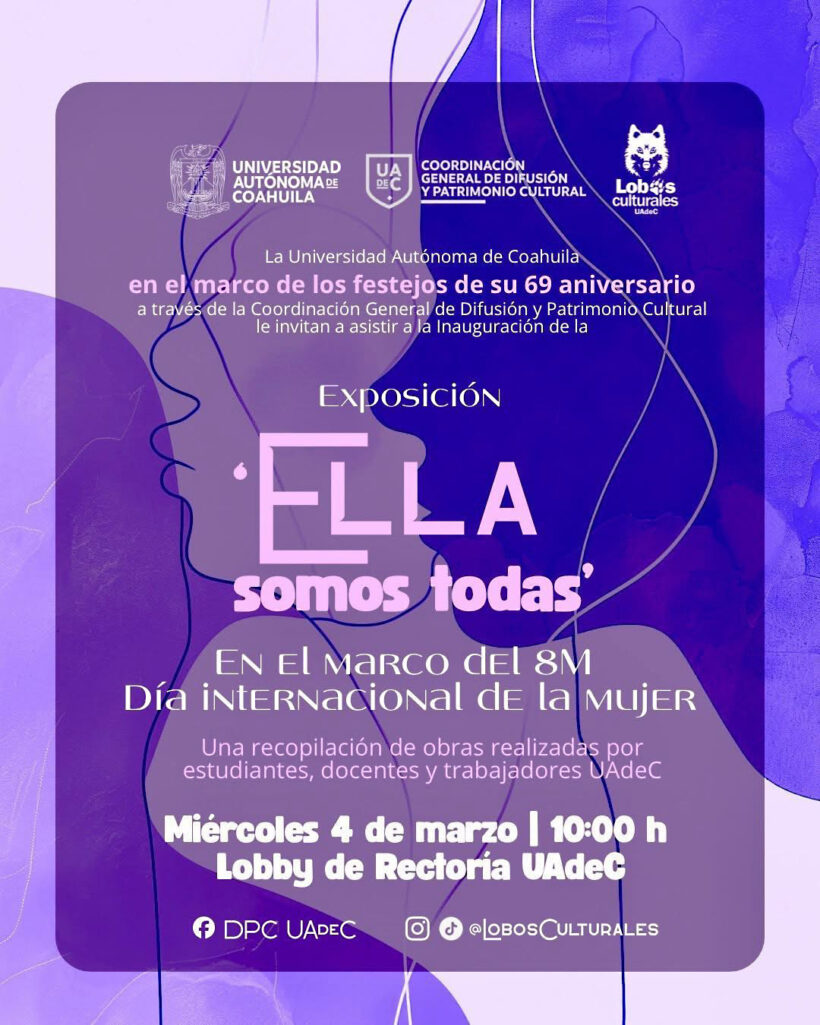 Asimismo, como parte de los festejos por el 69 aniversario de la máxima casa de estudios y en el contexto del 8M, la Coordinación General de Difusión y Patrimonio Cultural, a través del programa Lobos Culturales, inaugurará la exposición “Ella somos todas” el 4 de marzo a las 10:00 horas en el Lobby del edificio de la Rectoría.