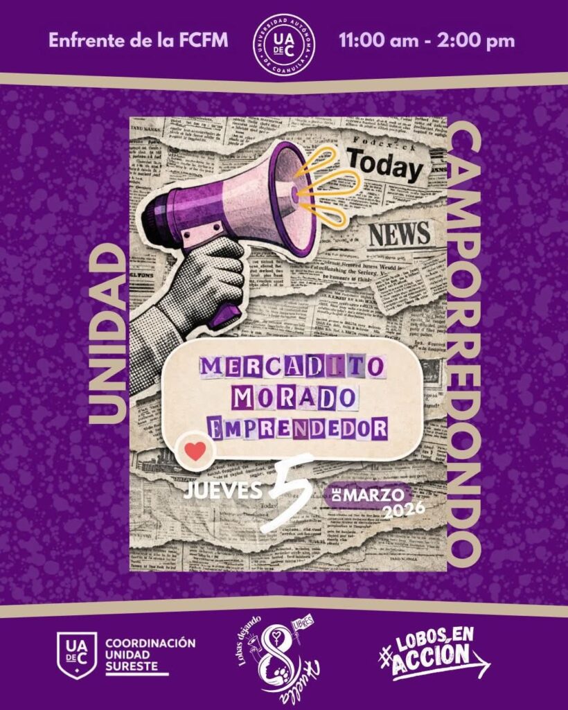 El 5 de marzo habrá un Mercadito Emprendedor en la explanada frente a la Facultad de Ciencia Educación y Humanidades de 11:00 a 14:00 horas y en Unidad Laguna en la Escuela de Ciencias de la Comunidad el Conversatorio Soy Mujer UA de C a las 10:00 horas y a las 17:00 horas en la sala audiovisual del plantel