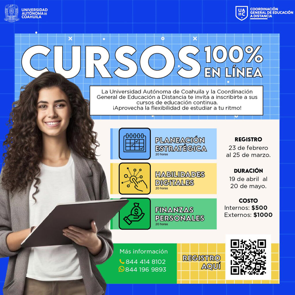 La Universidad Autónoma de Coahuila a través de la Coordinación General de Educación a Distancia, invita a la comunidad universitaria y público en general a inscribirse a su oferta de “Cursos en Línea” que se impartirán del 19 de abril al 20 de mayo de 2026.